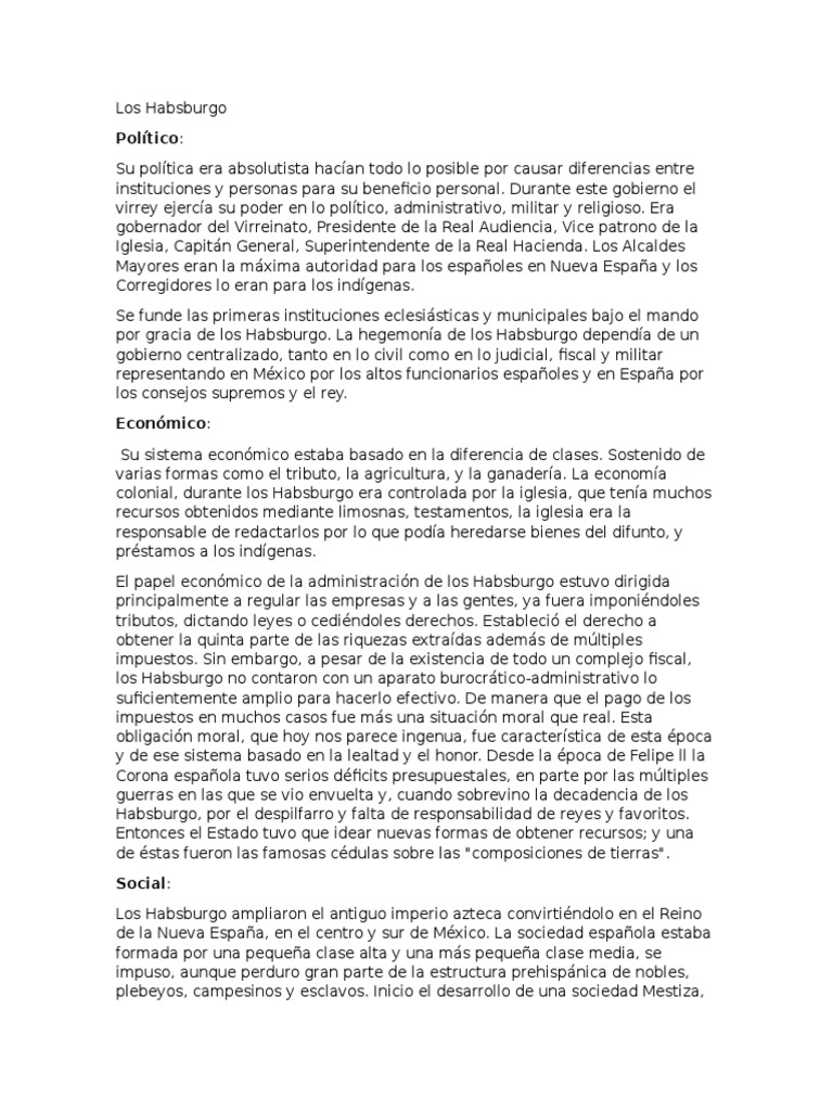 Los habsburgos fueron familia imperial originaria probablemente de alsacia que mantuvo el poder desde1452 a 1918. Al siglo xvii se le ha denominado como el de la integración y al xviii como el de las luces o de la ilustración. María teresa y carlos ii el hechizado. Durante este gobierno el virrey ejerca su poder en lo poltico administrativo militar y religioso.