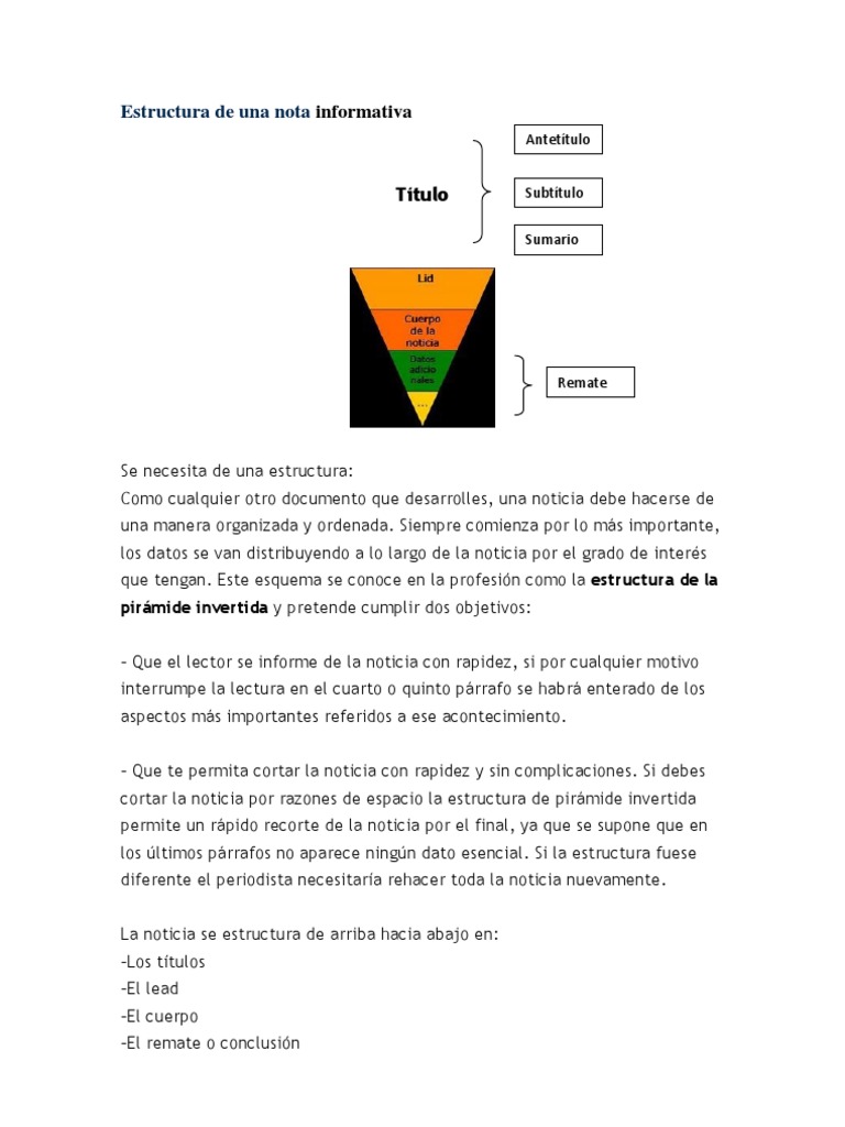 Estructura de la nota informativa. Lo más importante de la nota se escribe al inicio. Estructura de la nota informativa para recordar escribe tu pirámide invertida cuáles son las partes de la nota informativa. La entrada debe dar respuesta a interrogantes bàsicas como. Redacción de nota informativa estructura elementos para crear una nota informativa.